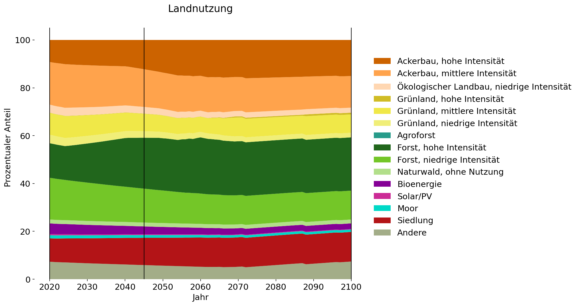 Bis 2045 zeigt sich eine deutliche und kontinuierliche Zunahme der landbasierten Senkenleistung. Dennoch ist der Landsektor allein nicht in der Lage, die 62 Millionen Tonnen CO₂-Bindung zu erreichen, die erforderlich sind, um das Neutralitätsziel von 5 % Restemissionen in diesem Jahr zu erreichen. Die Steigerung der Senkenleistung in diesem Szenario ist auf eine starke Zunahme des Schutzwaldes zurückzuführen. Dies resultiert einerseits aus der Aufforstung von Ackerflächen und andererseits aus der Veränderung der Waldbewirtschaftung, insbesondere von zuvor intensiv gemanagten Forstflächen. Auch extensiv bewirtschaftete Forstflächen nehmen zugunsten von intensiven Forst- und Landwirtschaftsflächen zu. Die insbesondere in der stofflichen Nutzung steigende Nachfrage nach Holz (u.a. im Bausektor), kann durch das bestehende Angebot gedeckt werden. Als Resultat dieser Landnutzungsänderungen nimmt die Biodiversität, wenngleich nur geringfügig, zu. Aufgrund zunehmender Ernährungsumstellungen, die den Rückgang des Fleischkonsums weiter verstärken, orientieren sich landwirtschaftliche Praktiken zunehmend auch an ökologischen Aspekten. So kann der Nahrungsmittelbedarf weiterhin gedeckt werden. Diese Veränderung im Einklang mit steigendem gesellschaftlichem Umweltbewusstsein zeigt sich anhand der konstanten Fläche für extensiven Ackerbau, während die intensive Landwirtschaft stark rückläufig ist. Weiterhin wird dies durch die fortschreitende Multifunktionalität der Landnutzung, wie die Zunahme von Agroforst-Flächen zeigt, bestärkt. Insbesondere in Städten nimmt die multifunktionale Flächennutzung durch integrierte Konzepte (Vertical Farming, nachhaltige Stadtentwicklungskonzepte) zu, wodurch die Siedlungsfläche trotz leichtem Bevölkerungswachstum nur minimal steigt. Trotz eines leicht rückläufigen Trends bleibt die Fläche für Bioenergie auf einem vergleichsweise hohen Niveau. Im Gegensatz dazu setzt sich der Trend des stagnierenden Ausbaus der Solarenergie aufgrund der hohen Flächenkonkurrenz zur landbasierten CO₂-Entnahme trotz der kontinuierlich steigenden Nachfrage fort.